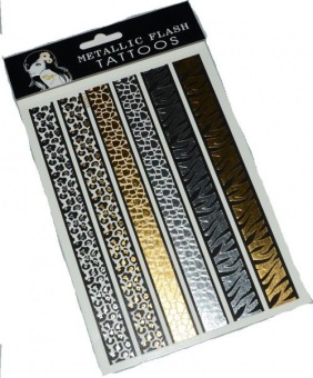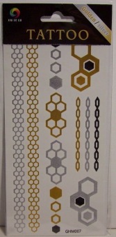 Tijdelijke sieraden Tattoo, blijft 3 tot 7 dagen zitten. Knip uit wat je leuk lijkt, en plak het dmv. een spons en wat water op de huid, en zie... een heel leuk effect, en omdat het goud-of zilverkleurig is weer eens iets anders!