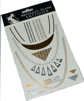 Tijdelijke sieraden Tattoo, blijft 3 tot 7 dagen zitten. Knip uit wat je leuk lijkt, en plak het dmv. een spons en wat water op de huid, en zie... een heel leuk effect, en omdat het goud-of zilverkleurig is weer eens iets anders!