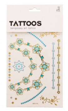 Tijdelijke sieraden Tattoo, blijft 3 tot 7 dagen zitten. Knip uit wat je leuk lijkt, en plak het dmv. een spons en wat water op de huid, en zie... een heel leuk effect, en omdat het goud-of zilverkleurig is weer eens iets anders! Deze heeft ook turqoise-kleurige elementen, nieuw!