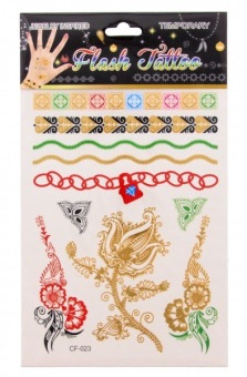 Tijdelijke sieraden Tattoo, blijft 3 tot 7 dagen zitten. Knip uit wat je leuk lijkt, en plak het dmv. een spons en wat water op de huid, en zie... een heel leuk effect, en omdat het goud met kleurtjes is weer eens iets anders!
