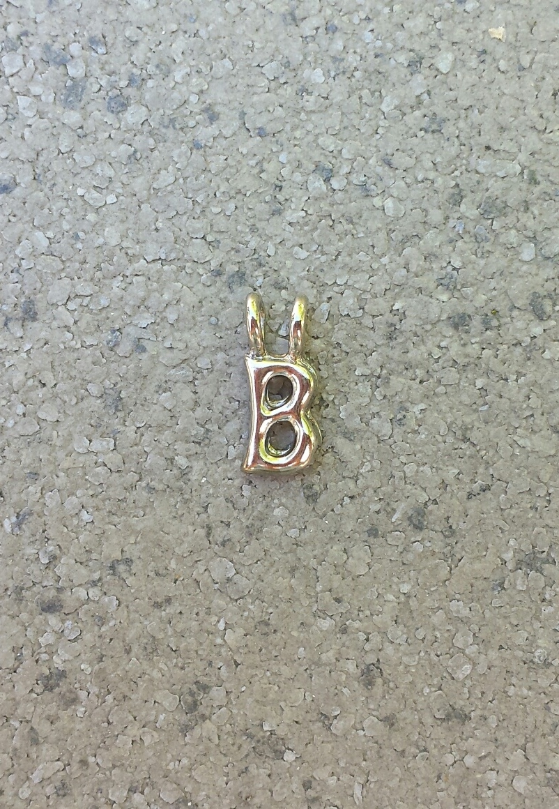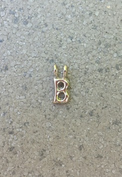 Hier gaat het om de letter B en als je een gehele ketting bestelt met zwart koord en veertjes-stoppers, geef dan even een seintje via het opmerkingenformulier (en de goed gespelde naam...) dan zetten wij hem voor je in elkaar met schuifknoopjes zoals het hoort!