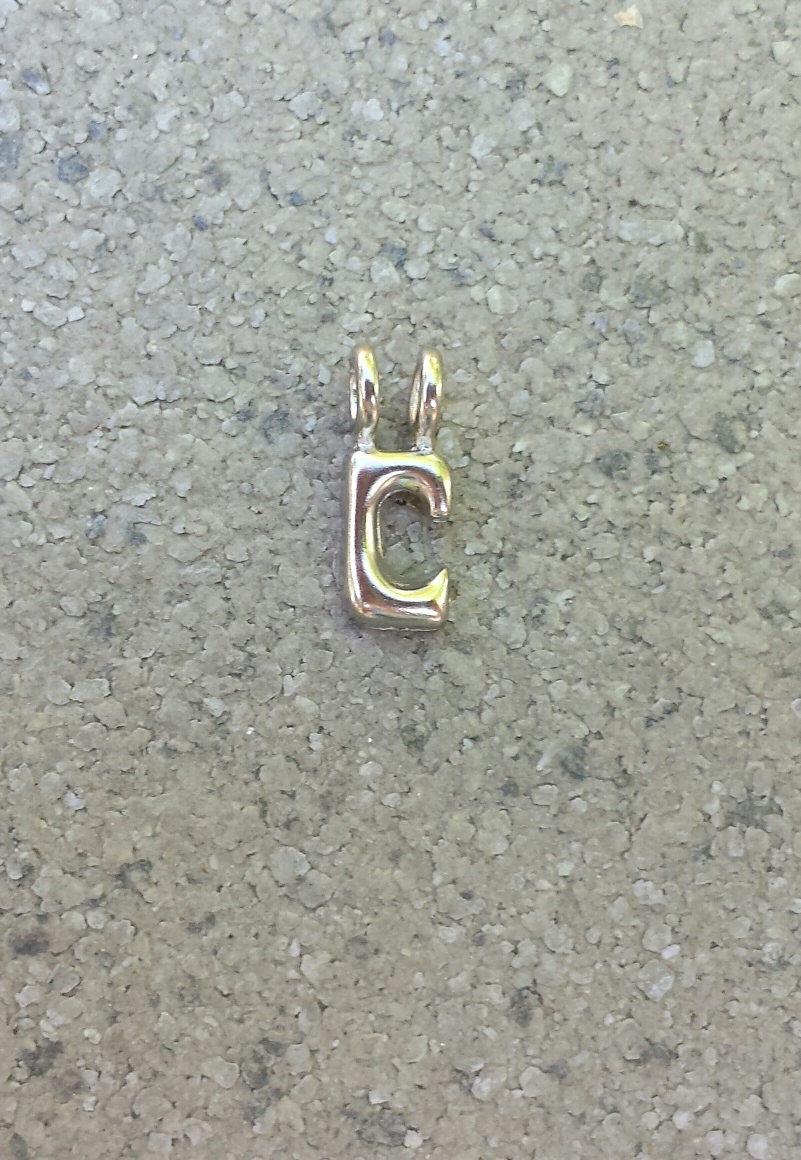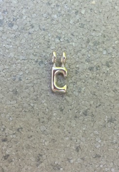 Hier gaat het om de letter C en als je een gehele ketting bestelt met zwart koord en veertjes-stoppers, geef dan even een seintje via het opmerkingenformulier (en de goed gespelde naam...) dan zetten wij hem voor je in elkaar met schuifknoopjes zoals het hoort!