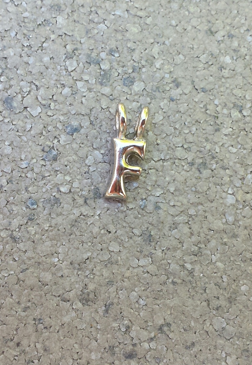 Hier gaat het om de letter F en als je een gehele ketting bestelt met zwart koord en veertjes-stoppers, geef dan even een seintje via het opmerkingenformulier (en de goed gespelde naam...) dan zetten wij hem voor je in elkaar met schuifknoopjes zoals het hoort!