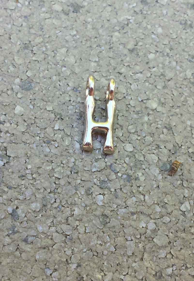 Hier gaat het om de letter H en als je een gehele ketting bestelt met zwart koord en veertjes-stoppers, geef dan even een seintje via het opmerkingenformulier (en de goed gespelde naam...) dan zetten wij hem voor je in elkaar met schuifknoopjes zoals het hoort!