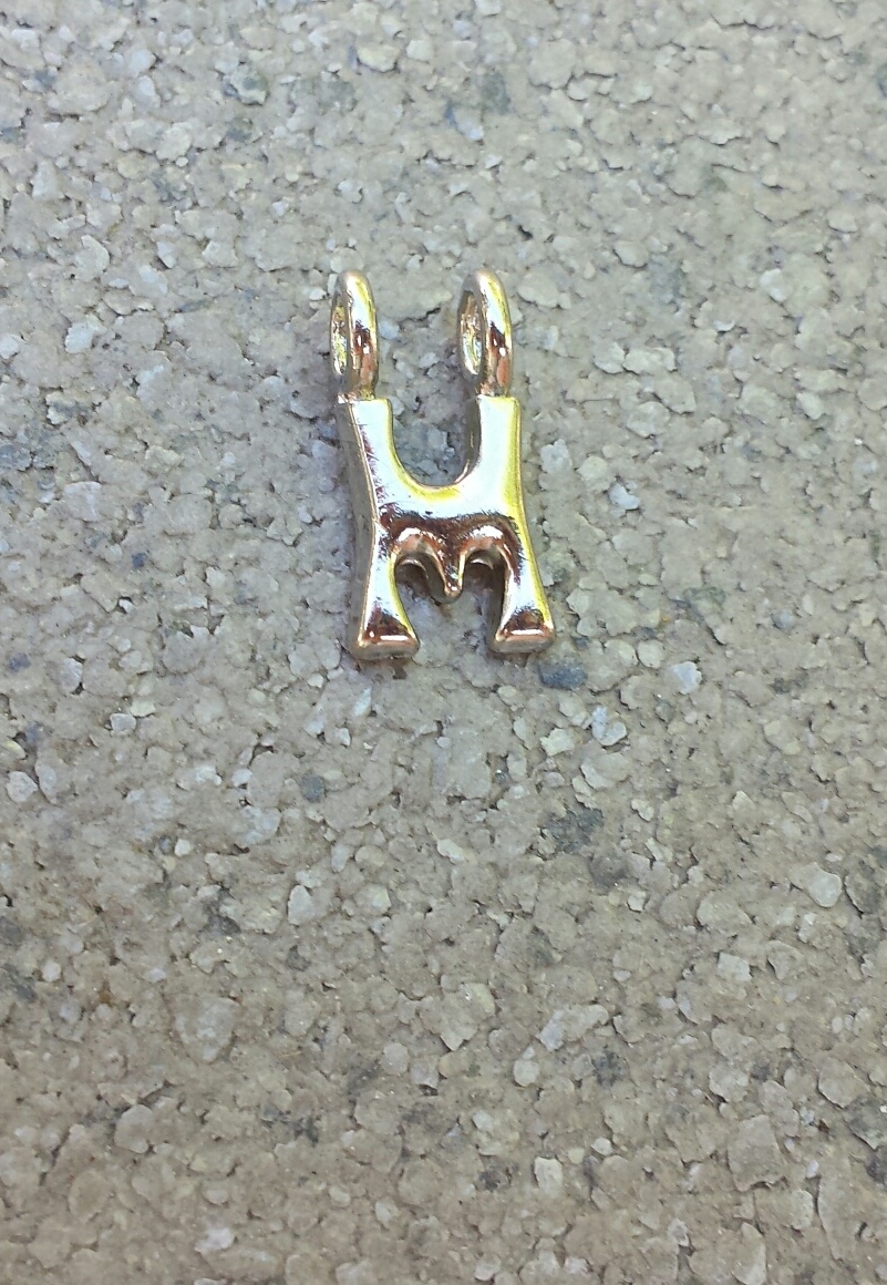 Hier gaat het om de letter M en als je een gehele ketting bestelt met zwart koord en veertjes-stoppers, geef dan even een seintje via het opmerkingenformulier (en de goed gespelde naam...) dan zetten wij hem voor je in elkaar met schuifknoopjes zoals het hoort!