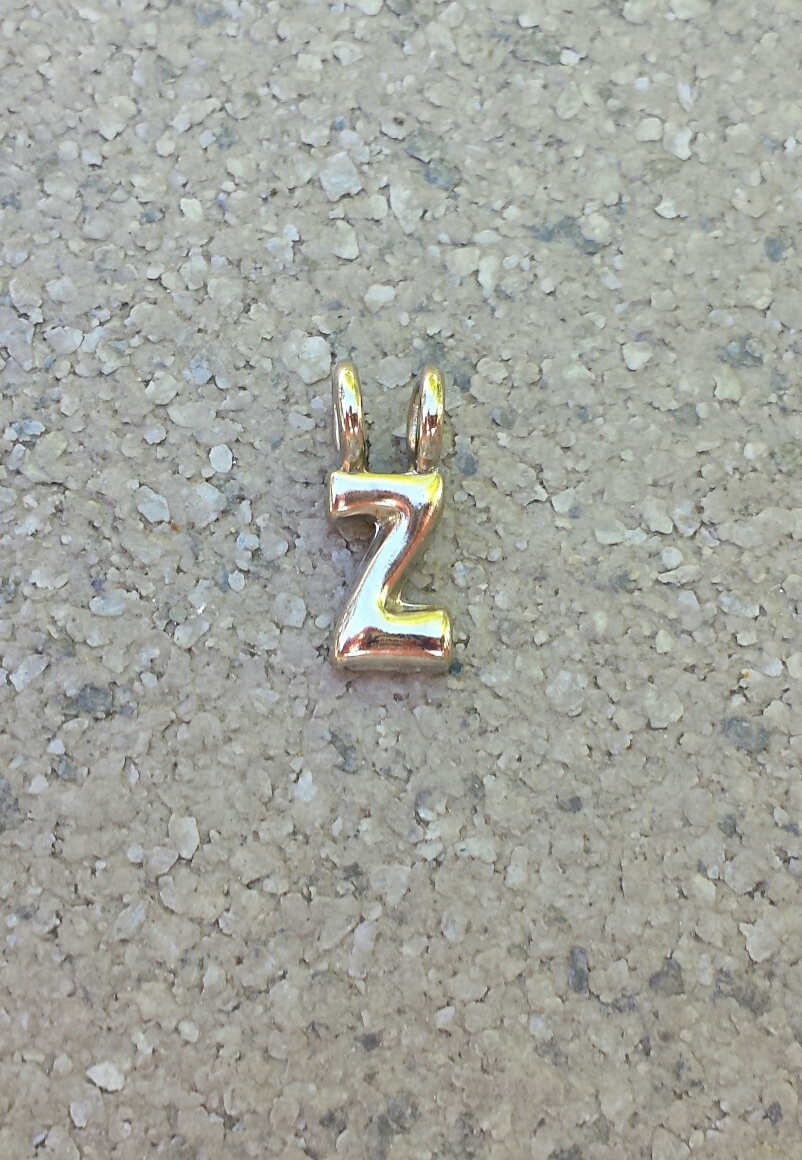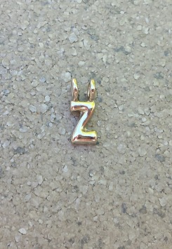 Hier gaat het om de letter Z en als je een gehele ketting bestelt met zwart koord en veertjes-stoppers, geef dan even een seintje via het opmerkingenformulier (en de goed gespelde naam...) dan zetten wij hem voor je in elkaar met schuifknoopjes zoals het hoort!