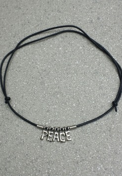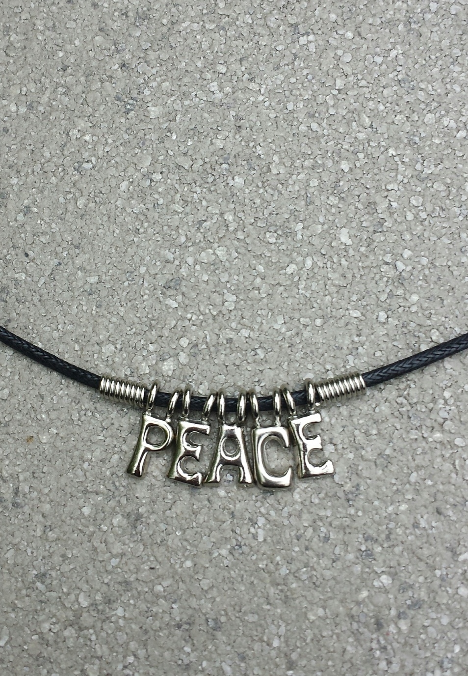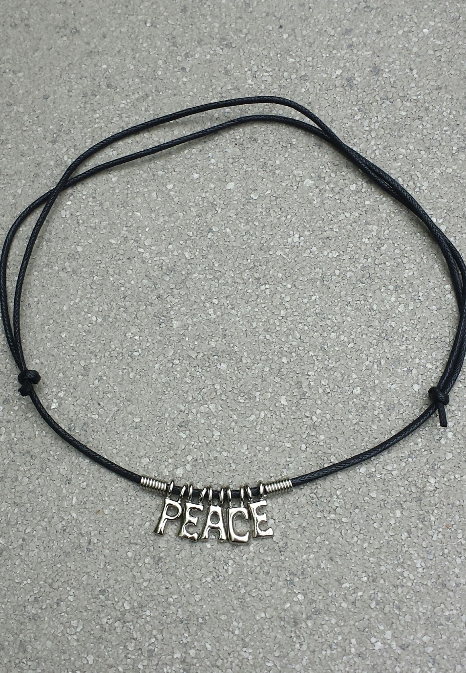 Ketting PEACE is verstelbaar van 35-50 cm door de schuifknoopjes. Grootte letters ong. 6 x 15 mm met ophang-oogjes. Dikte koord 2 mm.