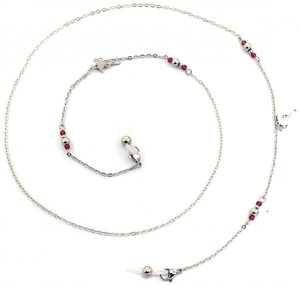 Deze zonnebril-ketting is toch veel leuker en origineler dan die saaie koordjes? Deze zonnebril-ketting bestaat uit een fijne zilverkleurige metalen ketting met flamingo's, bolle kralen en wijnrode facet kralen . Je kunt deze zonnebril-ketting ook voor je gewone (lees) bril gebruiken.