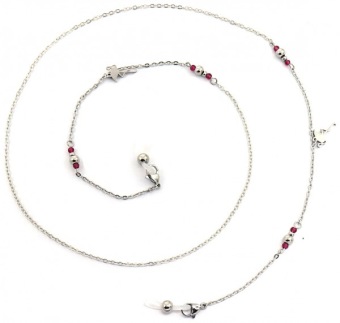 Deze zonnebril-ketting is toch veel leuker en origineler dan die saaie koordjes? Deze zonnebril-ketting bestaat uit een fijne zilverkleurige metalen ketting met flamingo's en wijnrode facet kralen . Je kunt deze zonnebril-ketting ook voor je gewone (lees) bril gebruiken.
