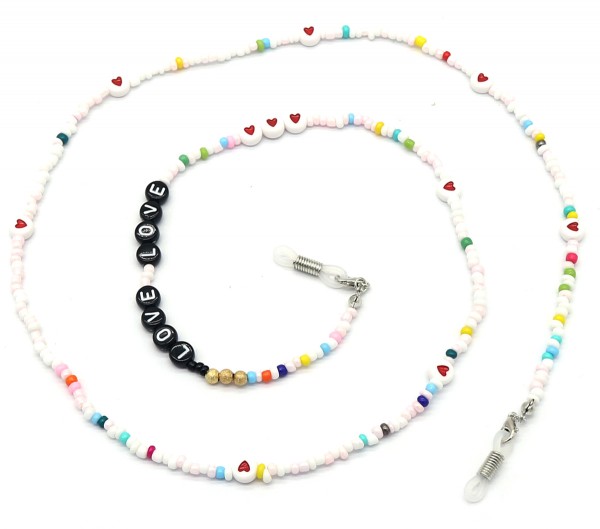 Deze zonnebril-ketting is toch veel leuker en origineler dan die saaie koordjes? Deze zonnebril-ketting bestaat uit kleine multicolor glas kraaltjes en kralen met hartjes en met Love. Je kunt deze zonnebril-ketting ook voor je gewone (lees) bril gebruiken.