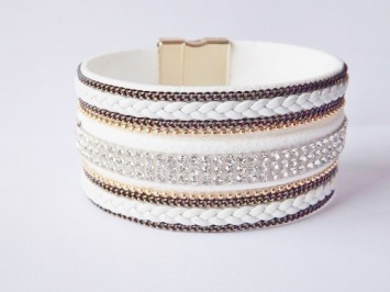 Deze armband bestaat uit meerdere bandjes op een vaste witte ondergrond, met gevlochten witte lederlook bandjes, strass en met bronzen en goudkleurige accenten. Sluit met goudkleurige magneetsluiting!