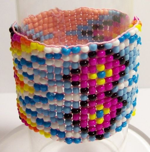 Leuke brede (4 cm) armband bestaande uit talloze gekleurde glazen kraaltjes, in een mooi etnisch motief geweven. De armband is elastisch en hoort aansluitend te worden gedragen. Als je hem plat legt is de lengte ong. 17 cm totaal (even de polsmaat meten!)