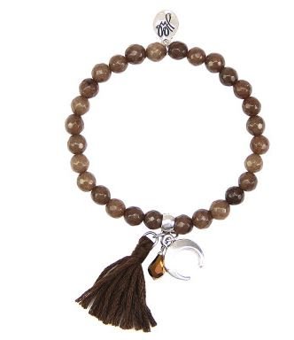 Deze armband bestaat uit bruine kralen, een bruin kwastje en bedels zoals een zilveren maan en een goudkl. glitterkraal. De armband is elastisch, maar valt klein, nl 16 cm. Van Yehwang.