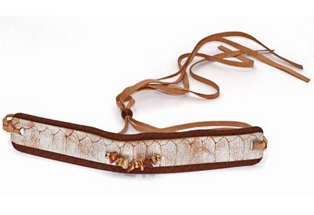 Dit is een zogenaamde upper-armband of boven armband en wordt dus aan de bovenarm gedragen. Hij is van bruin lederlook materiaal gemaakt met een bruin-zilveren slangenprint daar overheen. In het midden zitten bruine steentjes en gouden kraaltjes. De armband is verstelbaar en sluit eenvoudig met een strik.