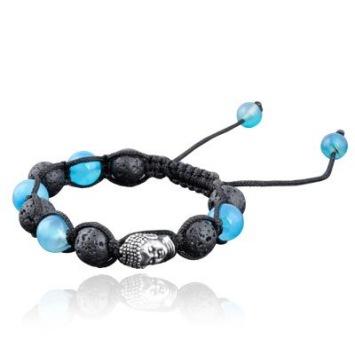 Armband Shamballa met zwarte lava-stones kralen, blauwe apatiet kralen en een zilverkleurig Boeddha-kopje.