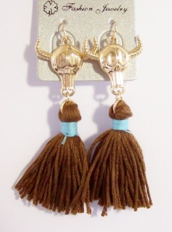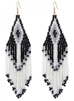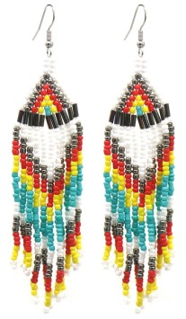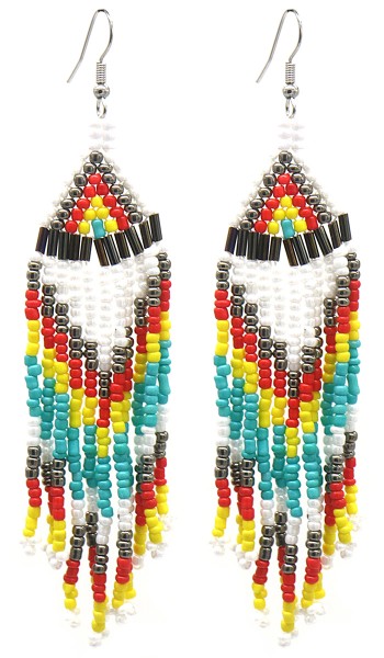 Hippe oorbellen in Boho Festival style met veel gekleurde glas kraaltjes aan sliertjes in wit, turquoise en andere kleuren.
