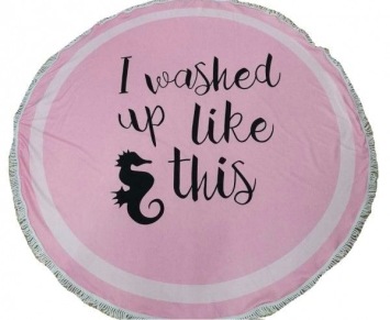 Deze Roundie Beach Towel is volledig roze met een zeepaardje en tekst erop. Van zachte badstof microvezel, droogt snel en is licht! Nu met gratis Cup Holder Flamiingo!