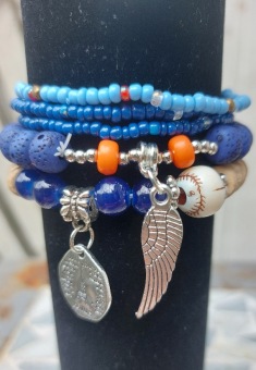 Deze Bohemian armbanden set bestaat uit 3 kleine kraaltjes armbandjes in het blauw en 2 armbanden met grotere kralen in blauw en bruin in verschillende en uitvoeringen. Aan de dikkere armbanden hangen bedels zoals een engelvleugel en een ronde bedel met de eiffeltoren.