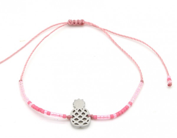 Fijn armbandje van slechts 1 mm (maar wel sterk) dik roze koord, met in het midden kleine Japanse kraaltjes in verschillende tinten roze en een Ananas ofwel Pineapple van stainless steel. Dit kleine zomerse armbandje is leuk om te combineren met andere armbandjes of gewoon minimalistisch solo te dragen! Het sluit met een schuifknoopsluiting en past dus (bijna) altijd!