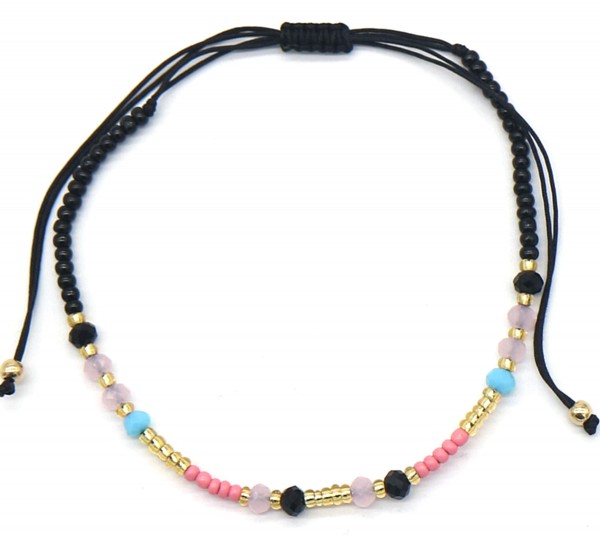 Fijn armbandje van 1mm zwart waxkoord met kleine glaskraaltjes in zwart, roze en goud. Tussen de kleine kraaltjes zitten ook wat grotere facetkralen in roze, blauw en zwart. De armbandjes sluiten met een aantrekkoordje zodat ze altijd passen. Leuk om samen te combineren met de andere kleuren armbandjes die verkrijgbaar zijn!
