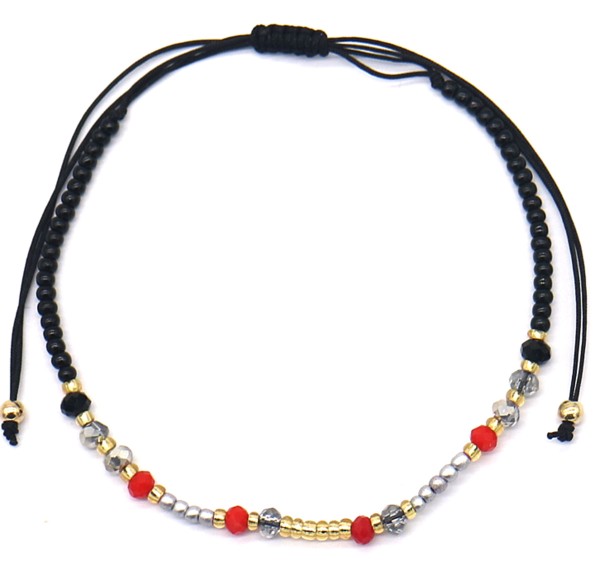 Fijn armbandje van 1mm zwart waxkoord met kleine glaskraaltjes in zwart, zilver en goud. Tussen de kleine kraaltjes zitten ook wat grotere facetkralen in rood en zilver. De armbandjes sluiten met een aantrekkoordje zodat ze altijd passen. Leuk om samen te combineren met de andere kleuren armbandjes die verkrijgbaar zijn!