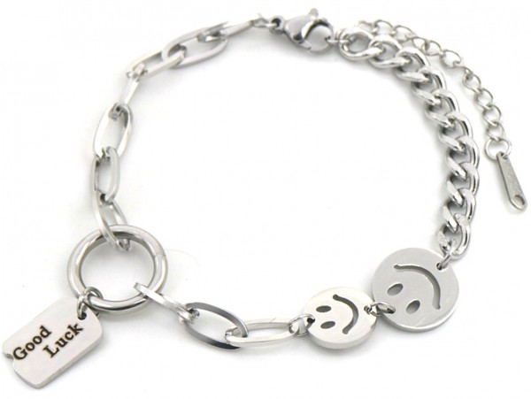 Deze armband bestaat uit verschillende grote (4 mm) schakels met Smileys en een ring met label met Good Luck eraan, van stainless steel!