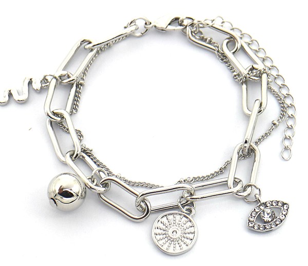 Deze armband bestaat uit langwerpige schakels met bedels eraan van zilverkleurig metaal, helemaal van nu, de grotere schakels! Tussen de schakels is een fijn schakelkettinkje geweven en bij de bedels zit oa. een slang en een evil eye!