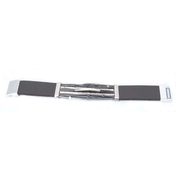 Deze Ibiza style armband bestaat uit een 2 cm brede band van donkergrijs imitatie-leer met in het midden strengen met vierkante zilveren kraaltjes, een zilver buisje en strass-steentjes ertussen.