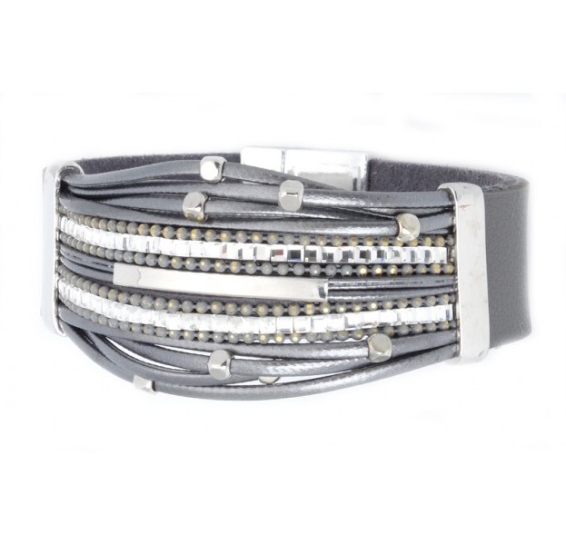 Deze Ibiza style armband bestaat uit een 2 cm brede band van donkergrijs imitatie-leer met in het midden strengen met vierkante zilveren kraaltjes, een zilver buisje en strass-steentjes ertussen. De armband sluit met een zilverkleurige magneetsluiting en de polsmaat is 18,5 cm.