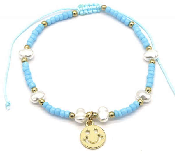 Fijn armbandje van 1 mm regenboog waxkoord met kleine glaskraaltjes in lichtblauw en tussendoor zoetwaterparels. Tussen de kraaltjes hangt een goudkleurige metalen Smilley!