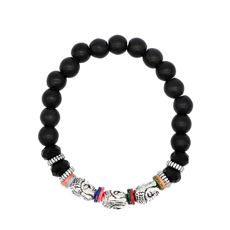 Kralen armband met zwarte blackstone kralen, zwarte facetkralen, gekleurde platte kralen en 3 zilverkleurige Boeddha-kopjes.