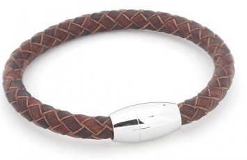 Deze stevige armband is van rond gevlochten bruin leer met stainless steel magneetsluiting.