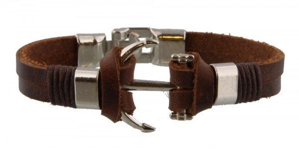 Armband van donkerbruin leer met in het midden een zilverkleurig metalen anker. De armband sluit met een metalen haaksluiting en is 19,5 cm lang, dit is dus de polsmaat, even meten dus!