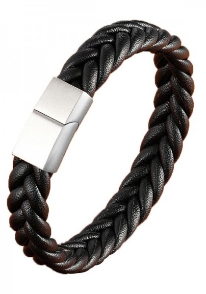 Deze stevige armband is gemaakt van zwart leer in een vlechtvorm. De schuifsluiting heeft ook een magneet, heeft een mat-zilver finish en is van stainless steel.