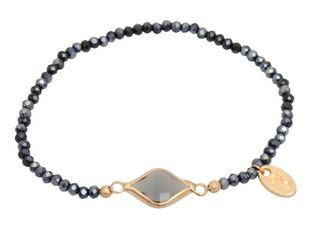 Dit armbandje bestaat uit fijne (3 mm) zwarte kralen met een vierkant steentje met goud-details (9 mm).