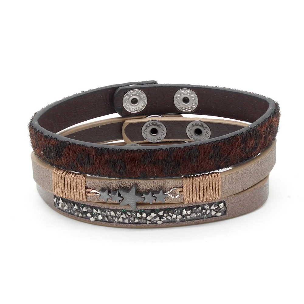 Leuke set van 3 lederlook armbandjes welke bestaat uit 1 bruin-zwart armbandje met Leopard oftewel luipaard look, het 2e armbandje is van taupe bruin glans lederlook materiaal met zilvergrijze sterren, en het 3e armbandje is ook van taupe bruin lederlook glans materiaal met strass-steentjes in het midden.