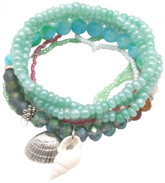 Set van 8 armbandjes van kraaltjes in verschillende diktes in meest licht-groen, en ook een armband met dikkere turquoise kralen. Tussendoor hangen een echt wit schelpje en een zilverkleurig metalen schelpje.