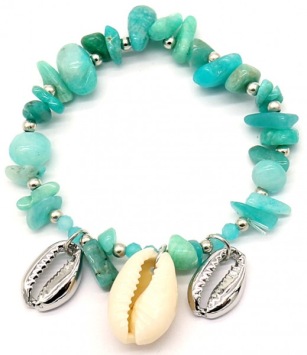 Armbandje met Amazone steentjes, naturel schelp en zilverkleurige schelpjes en kraaltjes. De Amazone-steentjes zijn half-edelsteentjes en mooi groen-blauw van kleur. Het armbandje is elastisch.