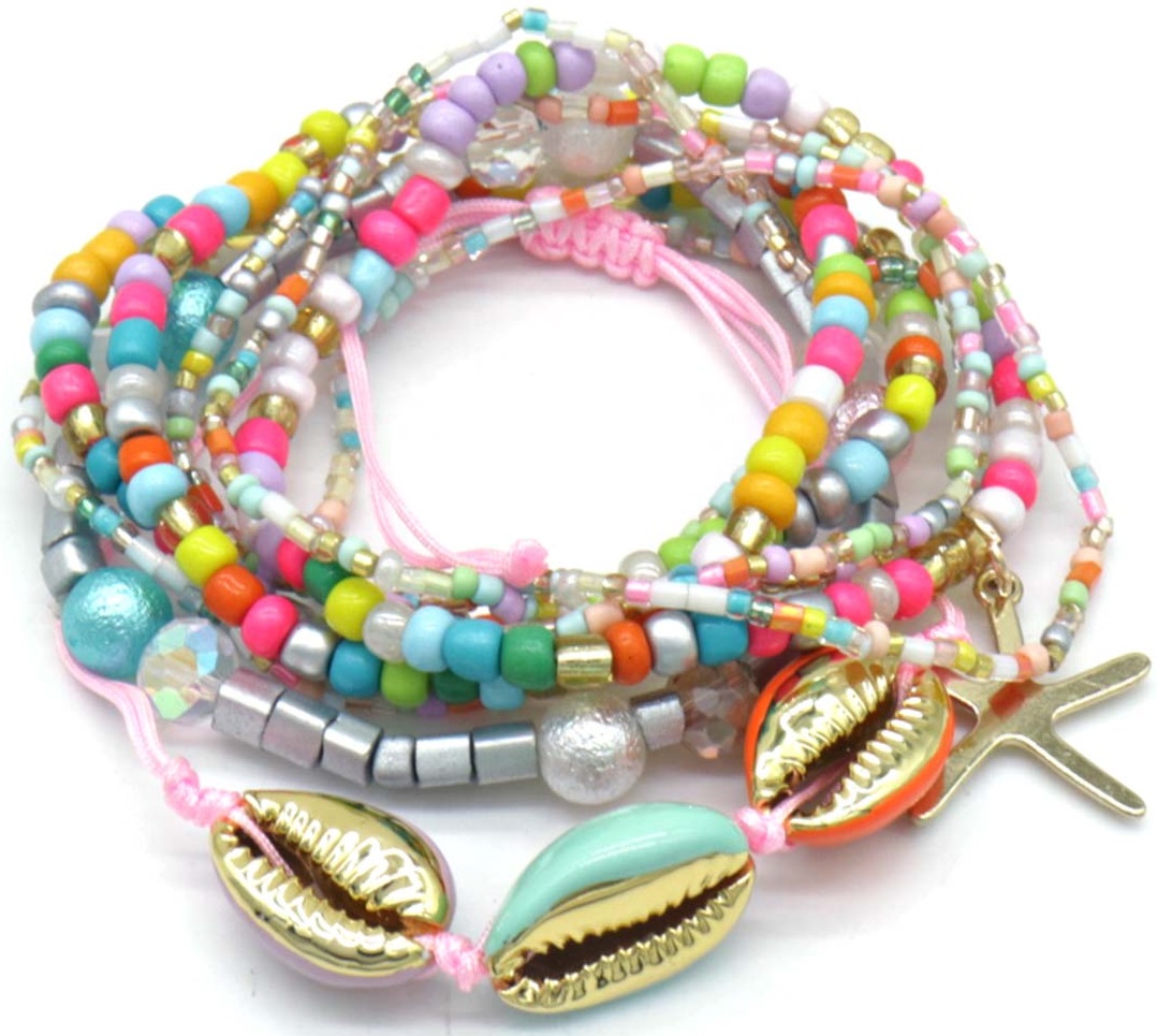 Set van 9 armbandjes waarvan 8 van glaskraaltjes in versch. groottes in multicolor, 1 armband met multicolor/goud schelpen en aantrek-koordje. Aan een van de armbandjes hangt een goudkl. zeester.