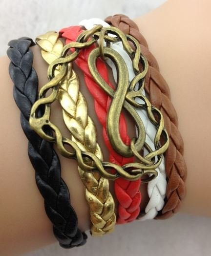 Deze armband is iets anders dan de andere, hij bestaat uit 5 verschillende (zwart, goud, rood, wit, bruin) lederlook gevlochten bandjes met over alle bandjes heen een bronzen hart met Infinity-teken er in. De lengte is verstelbaar van 16-21 cm, de breedte is ong. 3 cm.