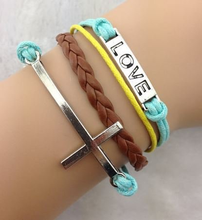 Dit armbandje bestaat uit 1 bruin gevlochten bandje, 1 geel koordje en meerdere turqoise koordjes met Love en een groot kruis in zilverkleurig metaal, alles samen in 1 verstelbare sluiting. Let op, dit armbandje heeft géén Infinity-teken!  Lengte 16-21 cm, breedte ong. 3 cm.