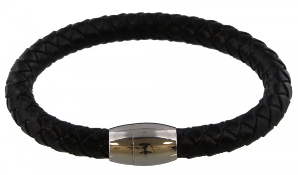 Deze stevige armband is van rond gevlochten 9 mm zwart leer met stainless steel magneetsluiting. Lengte 21 cm (polsmaat).