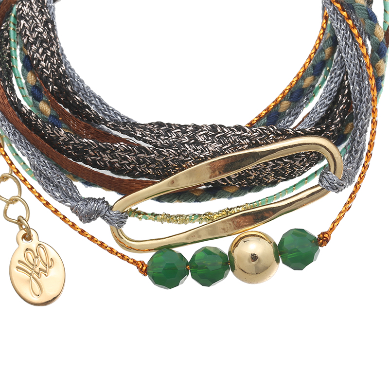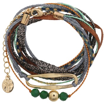 Deze wrap of wikkelarmband bestaat uit meerdere fijne stoffen lintjes met groene, bruine en gouden details samen in een sluiting.