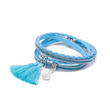 Hij heeft 1 bandje met turqoise strass steentjes en 1 blauw lederlook gevlochten bandje, met 2 turqoise kwastjes en een witte steen hangbedel. Hij sluit met handige magneetsluiting.