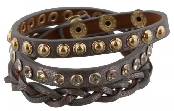 Deze wrap of wikkel armband is van grijs glitter-leer en bestaat uit een gevlochten gedeelte, een met strass-steentjes en een met goudkl. studs. Sluit met 3 drukknopen en is voor 3 x rond de pols.