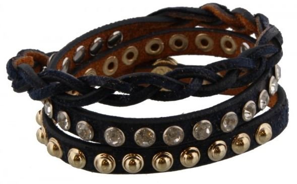 Deze wrap of wikkel armband is van zwart glitter-leer en bestaat uit een gevlochten gedeelte, een met strass-steentjes en een met goudkl. studs. Sluit met 3 drukknopen en is voor 3 x rond de pols.