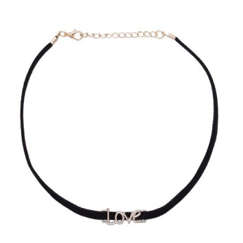 Deze choker bestaat uit een zwart suèdelook bandje (5 mm) met in het midden het woord Love in zilverkleurig metaal. Het slotje en kettinkje is van goudkleurig metaal.