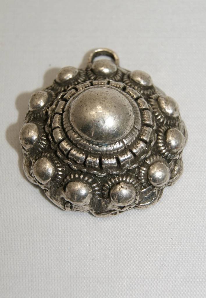 Verzilverde hanger van een grote bolle Zeeuwse knop (3,5 cm doorsnee en 2 cm hoog) met ophang-oogje, heeft een mooie antiek oud-zilveren uitstraling!