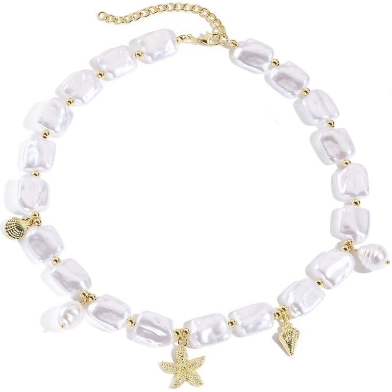 Ontdek deze prachtige Beach Vibe ketting, een korte ketting die perfect is voor elke strandliefhebber. Deze ketting is samengesteld uit grote golvende platte parelkralen, afgewisseld met goudkleurige kraaltjes, hangende parels en goudkleurige metalen bedels zoals een zeester en schelpen. Ondanks zijn robuuste uitstraling is deze ketting lichtgewicht, dankzij de kunststof parelkralen.