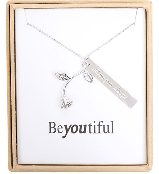 Fijne korte ketting (1 mm) met als hangertjes een 3D roosje met blaadjes en een tag of plaatje met de Quote 'Love you always'. Het wordt geleverd in een mooi cadeau-doosje met de Quote 'Beyoutiful' . Leuk voor je lief of bijv. moederdag!